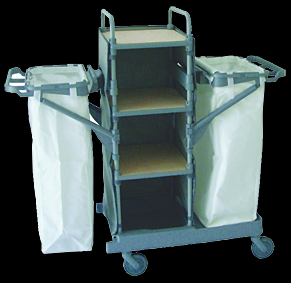 Chariot de service pour un maximum de 8 chambres520 x 1275 x 1330 H• Base centrale en polypropylène• 4 roues plastique Ø 125 mm• Montants en Rilsan Ø 22 mm• 3 plateaux en Formica 460 x 390 mm• 2 supports sac 120 Litres• Panneau en PVC avec velcro• Poids 20,6 kg• Livré sans sac